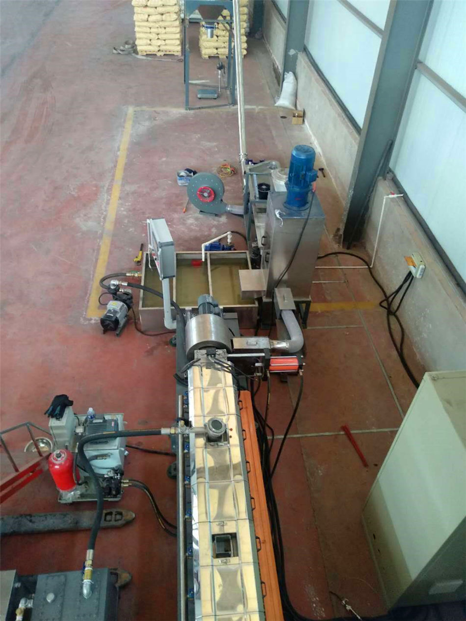 (三)水拉條輔機(jī) 1)水槽:一臺(tái),L=6米,加寬加深,槽體為不銹鋼材質(zhì);水槽與吸干機(jī)過(guò)度體一件;不銹鋼材質(zhì),水槽熱水經(jīng)過(guò)濾器到環(huán)保型冷卻器;水槽架里安裝:4組環(huán)保風(fēng)冷卻系統(tǒng)(環(huán)保型:發(fā)明專利號(hào):CN201911312134.6)不需要接外循環(huán)水冷卻,不用徘外水;采用閉環(huán)循環(huán)系統(tǒng); 2)吹干機(jī):一臺(tái),功率1.5kw;與物料接觸件均為不銹鋼材質(zhì)。3)龍門切粒機(jī):壹臺(tái),功率4kw,變頻調(diào)速;切粒機(jī)動(dòng)刀刀口采用鎢鋼材質(zhì)4)加長(zhǎng)振動(dòng)篩:一臺(tái),L=2.5m,電機(jī)采用:震動(dòng)專用電機(jī);震動(dòng)量可以調(diào)節(jié)大小:電機(jī)功率率:0.55KW兩臺(tái);振動(dòng)篩篩網(wǎng)采用三層分離物料;大孔直徑φ8mm,小孔直徑φ2.5mm,不銹鋼材質(zhì),振動(dòng)篩出廠時(shí);振動(dòng)量調(diào)節(jié)到最??;5)風(fēng)吹料倉(cāng):一套,1m3料倉(cāng)一件,不銹鋼材質(zhì);采用φ130mm不銹鋼管聯(lián)接;3kw物料輸送風(fēng)機(jī)。雙螺桿塑料造粒機(jī) http://m.ywkzsh.com/contents/13/79.html